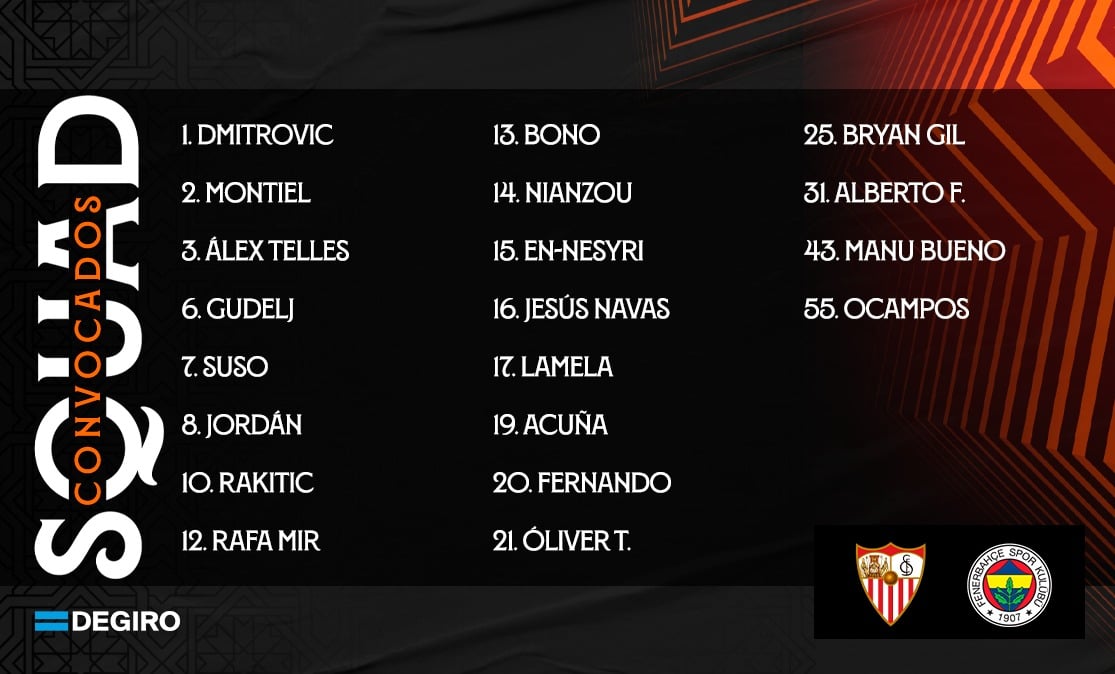 La lista de futbolistas la conforman: Bono, Dmitrovic, Alberto Flores, Jesús Navas, Montiel, Acuña, Telles, Nianzou, Fernando, Gudelj, Jordán, Manu Bueno, Rakitic, Ó. Torres, Suso, Ocampos, Lamela, Bryan Gil, Rafa Mir y En-Nesyri.