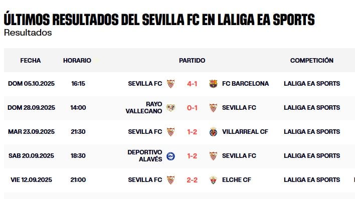 Hasta la fecha, el Sevilla FC se ha mostrado mucho más certero como visitante, pues ha logrado nueve de sus 13 puntos jugando lejos de la capital de Andalucía. Sólo ha perdido contra el Athletic Club (3-2) en la primera jornada de LaLiga 25/26 y ha vencido de manera consecutiva al Girona FC (0-2), al Deportivo Alavés (1-2) y al Rayo Vallecano (0-1). En cambio, en casa suma cuatro puntos de nueve después de golear al Barcelona (4-1) tras perder contra el Getafe CF (1-2) y el Villarreal CF (1-2), así como empatar entre medias con el Elche CF (2-2).