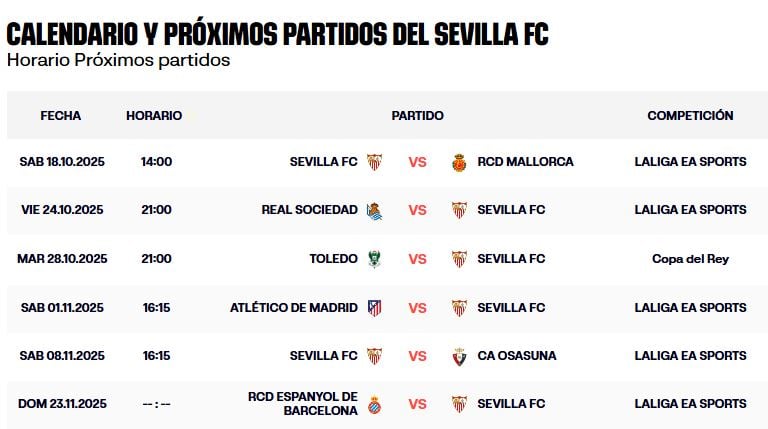 La tanda de encuentros de las selecciones nacionales concluirá entre las noches de este martes y de mañana miércoles por un espacio de tres semanas de duración y entregará el testigo para el regreso de LaLiga EA Sports, que vuelve el próximo fin de semana con la disputa de la jornada 9 en Primera división. En el caso del Sevilla FC, los pupilos de Matías Almeyda defenderán su meritoria sexta plaza de la clasificación y su estado de euforia por los buenos resultados cosechados antes de este segundo parón de la temporada -dos victorias seguidas tras pasar 18 meses sin enlazar alegrías- recibiendo en el Ramón Sánchez-Pizjuán al RCD Mallorca, en el primero de los cinco encuentros oficiales que afrontarán hasta el siguiente paréntesis liguero de mediados de noviembre. En el campeonato de la regularidad testará su fiabilidad ante rivales 'incómodos' como son el RCD Mallorca, el Atlético de Madrid, la Real Sociedad y el CA Osasuna; mientras que en el 'torneo del K.O.' se la jugará en el campo del CD Toledo.