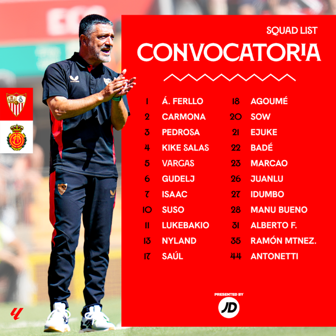 De este modo, la lista al completo con los 22 futbolistas convocados por García Pimienta para el encuentro entre el Sevilla FC y el RCD Mallorca esta compuesta por los porteros Orjan Nyland, Álvaro Ferllo y Alberto Flores; los defensores José Ángel Carmona, Loïc Badé, Marcao Teixeira, Kike Salas, Ramón Martínez y Adriá Pedrosa; los centrocampistas Nemanja Gudelj, Lucien Agoumé, Djibril Sow, Juanlu Sánchez, Saúl Ñíguez y Manu Bueno; los extremos Rubén Vargas, Dodi Lukebakio, Chidera Ejuke, Stanis Idumbo Muzambo y Suso Fernández; y los delanteros Isaac Romero y Leandro Antonetti.