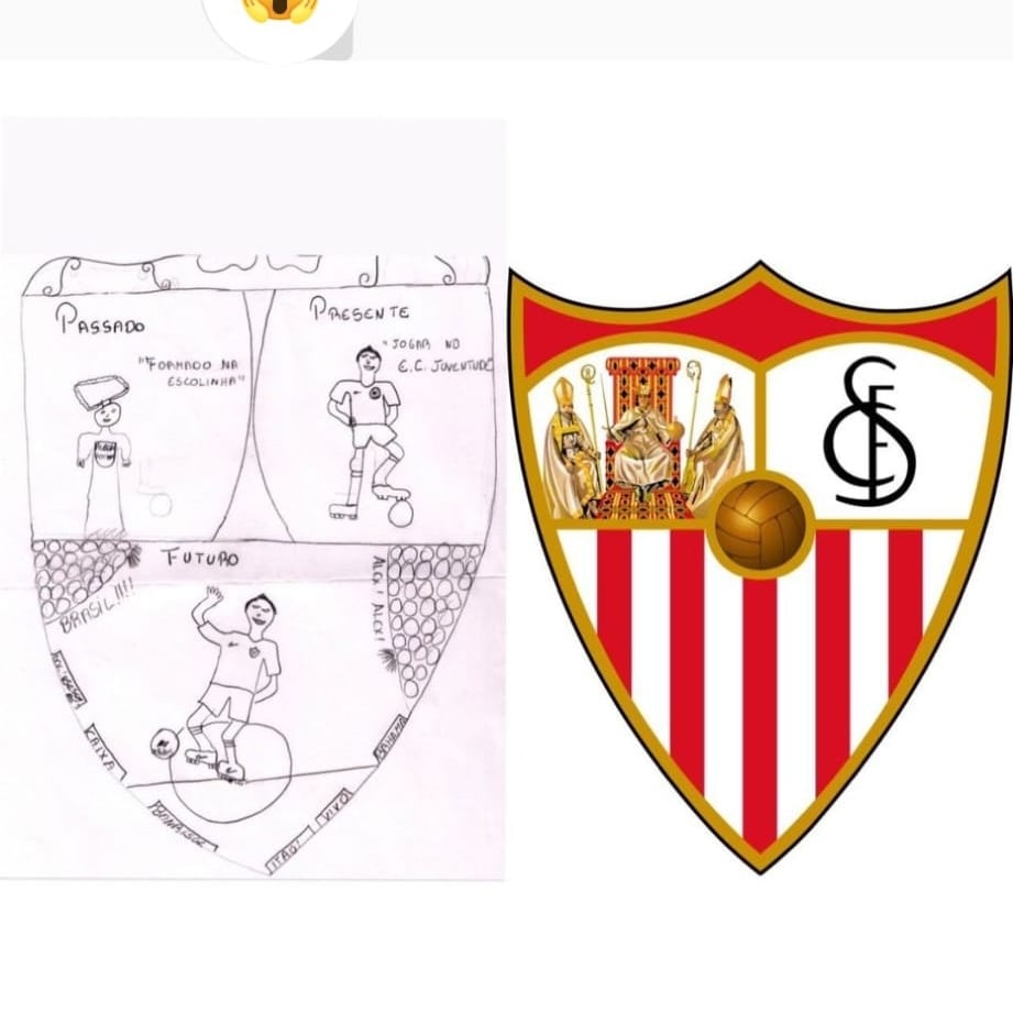 Pero además de hacer ese dibujo tan premonitorio, su esposa vio una coincidencia más pues el dibujo de Alex Telles está enmarcado en un escudo cuya silueta es muy parecida a la del escudo del Sevilla FC, "en shock' como dice su esposa, se quedó al ver tan tremenda casualidad.