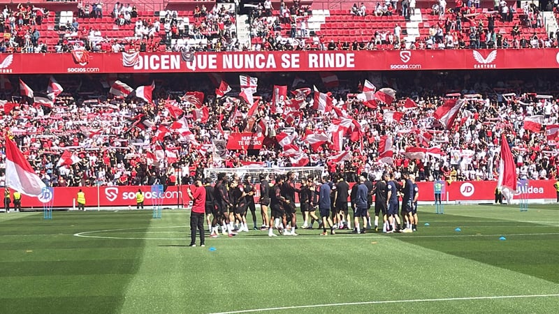 "Y aquí están, aquí están, los ultras del Sánchez-Pizjuán". Tras ejercitarse, la plantilla ha dado la tradicional vuelta de honor para mostrar gratitud y ha acabado fundiéndose en la euforia colectiva botando sobre el césped y cantando al unísono los vítores propulsados por más de 15.000 gargantas. Qué manera de cargar energía positiva. Viendo estas imágenes tan motivadoras (incluso en épocas tan desalentadoras), sólo cabe preguntarse por qué los clubes no abren más a menudo sus puertas. El Gran Derbi ya corre por las venas. Se siente. Ya se ha empezado a jugar. Ahora, tras resonar el clásico "Échale huevos, Sevilla échale huevos...", que el balón dicte sentencia.