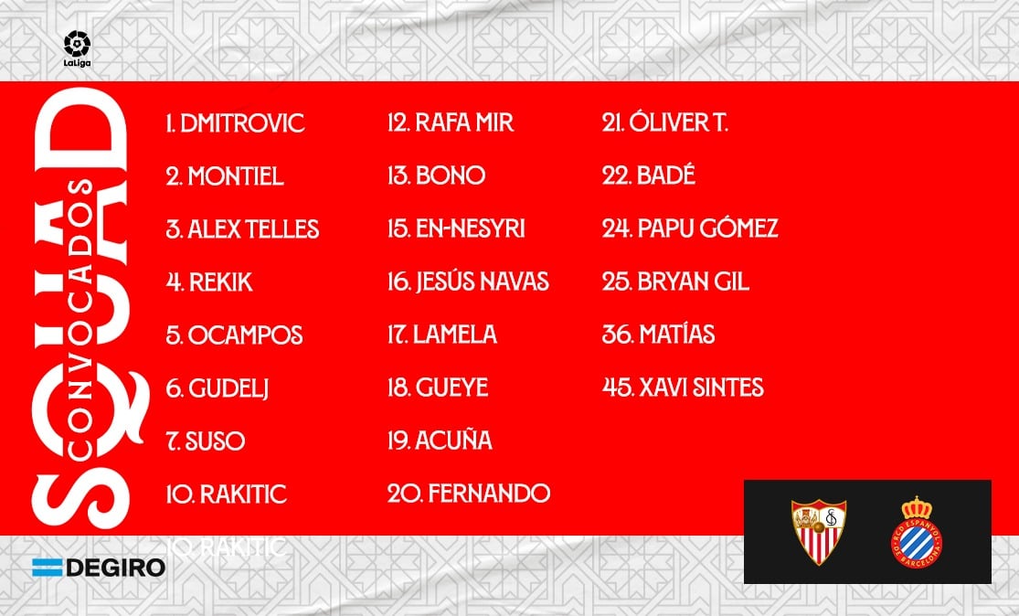 La lista de 22 la conforman los porteros Dmitrovic, Bono y Matías; los defensas Montiel, Alex Telles, Rekik, Jesús Navas, Acuña; Xavi Sintes y Badé; los centrocampistas Ocampos, Gudelj, Suso, Rakitic, Pape Gueye, Lamela, Fernando, Óliver Torres, Papu Gómez y Bryan Gil; así como los delanteros En-Nesyri y Rafa Mir.