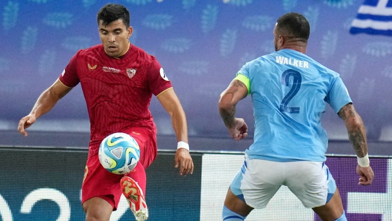 Pese a estar cerca de salir del Sevilla, Acuña fue titular en la Supercopa de Europa ante el City. @AcunaMarcos17