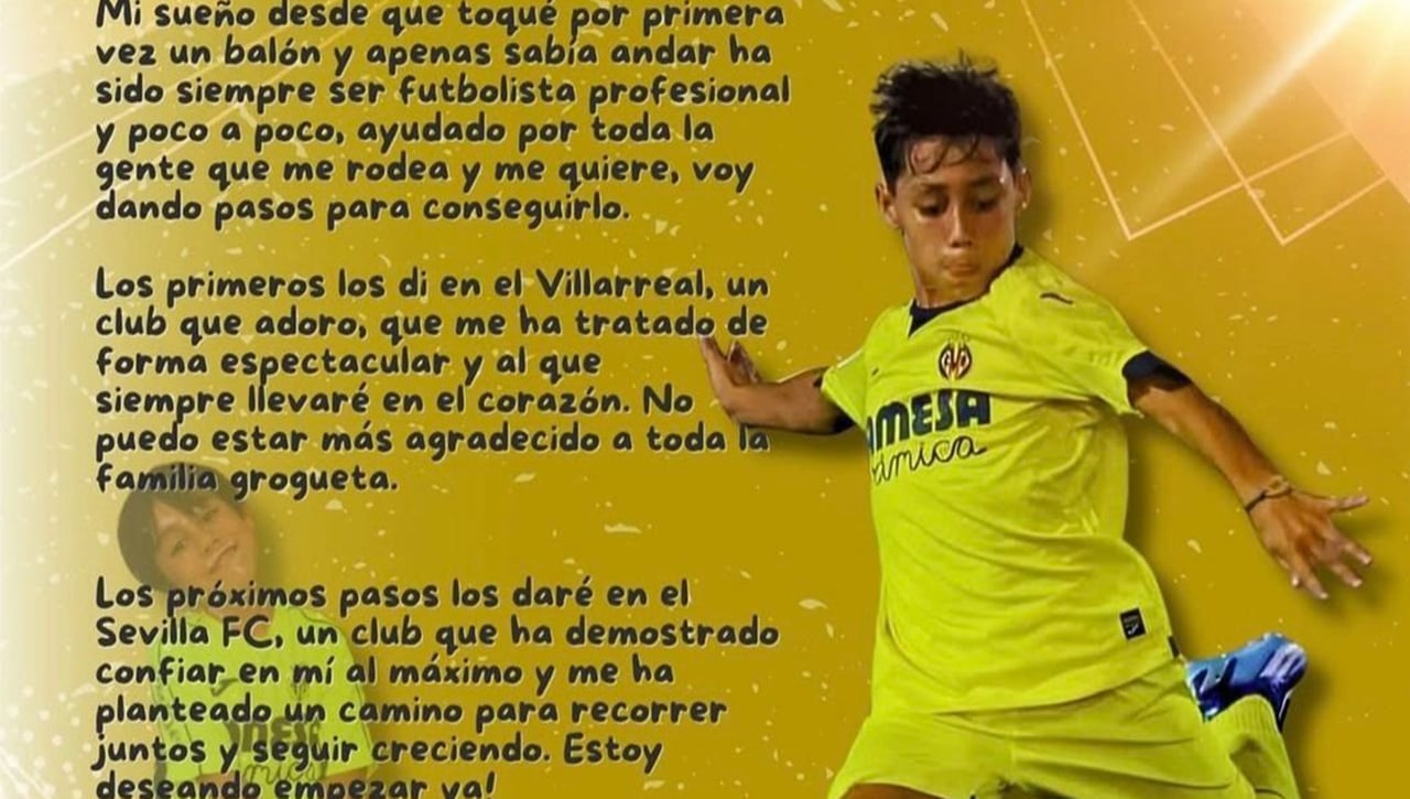 El futbolista infantil, de los más prometedores de la cantera amarilla, ha sido el encargado de anunciar su llegada a Nervión con un comunicado impropio a edades tan tempranas y que ha generado cierta controversia