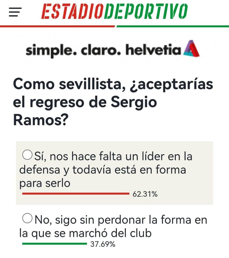 Así las cosas, ESTADIO Deportivo le ha preguntado a sus lectores sevillistas si consideran necesario el regreso de Sergio Ramos. Y la respuesta es claramente afirmativa con más de un 62% de los votos. Aunque todavía existe una parte del sevillismo que no perdona la forma de marcharse del club y algunos gestos que ha tenido a lo largo de su carrera cuando le pitaban en el Sánchez-Pizjuán, la falta de un central de garantías y con capacidad de liderazgo en el equipo de Mendilinar hace prioritaria la llegada de Sergio Ramos. Sin duda, parece que el rencor de la parroquia sevillista va disminuyendo conforme van quedando menos días para que el mercado de fichajes eche su telón de ciere.
