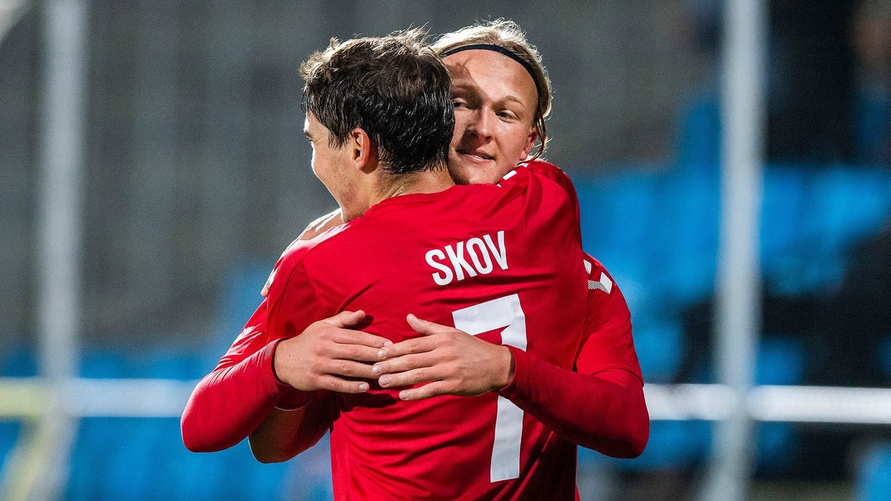 El delantero abraza a su compañero de selección Skov.@dolbergofficial