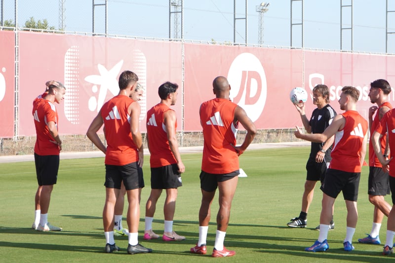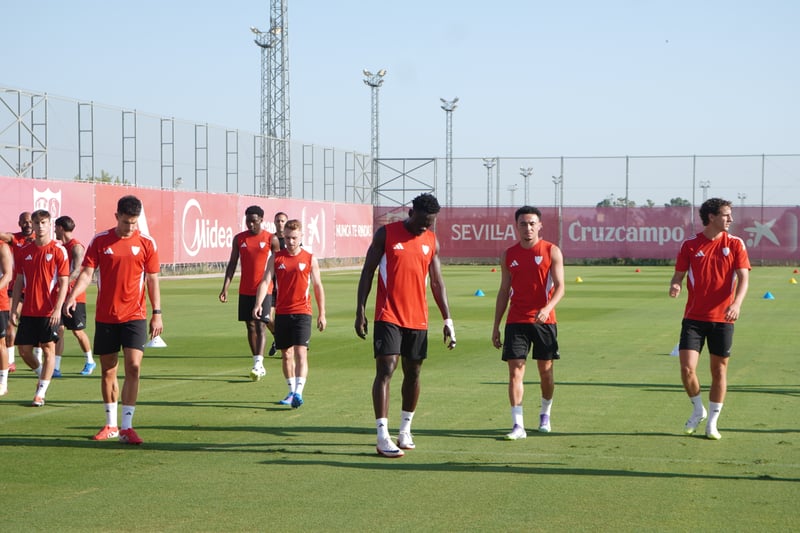 Últimos coletazos de la cuarta semana de entrenamientos en el Sevilla FC antes de afrontar la doble cita ante Olympique de Marsella y Al-Qadsiah. El conjunto nervionense mantiene el ritmo diario de entrenamientos donde las altas temperaturas elevan la exigencia física hasta el límite. En el doble campo más cercano al edificio del primer equipo, como así acostumbra a trabajar Matías Almeyda desde su llegada a la entidad, la plantilla sumó una nueva sesión en horario matutino. Fueron un día más Juanjo del Ojo y Guido Bonini, encargados de explotar la forma física de la plantilla, quienes asumieron el peso de los primeros ejercicios. Llevaron hasta la extenuación al colectivo de tal manera que fue recurrente las muestras de agotamiento entre futbolistas como Akor Adams, cuyo abrir de boca resultó delatador tras varios sprints explosivos.