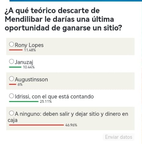 Según la encuesta propuesta por ESTADIO Deportivo, ninguno de los claros descartes del de Zaldívar merece una última oportunidad. De esta forma, casi la mitad de los participantes (un 47%) entiende que lo mejor es que todos ellos deben salir, aunque un 25% se la daría a Idrissi, el único que le está haciendo tilín hasta la fecha al entrenador, mientras que prácticamente un 12% se decanta por Rony, siendo menor (10,44%) el porcentaje de apoyo a Januzaj, casi testimonial con Augustinsson.