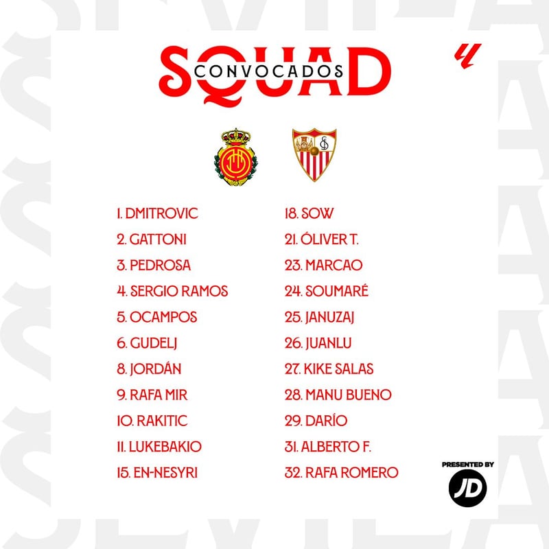 Completan el parte de bajas, además de los ya citados y un Alfonso Pastor que ni siquiera fue inscrito al ser intervenido este verano del menisco, los consabidos Suso Fernández, Erik Lamela, Mariano Díaz, Orjan Nyland, Tanguy Nianzou y Loïc Badé. El lista completo está formado por: los porteros Dmitrovic, Alberto Flores y Rafa Romero (otra de las novedades, procedente del Sevilla C); los defensas Juanlu, Darío Benavides, Sergio Ramos, Marcao, Gudelj, Gattoni, Kike Salas y Pedrosa; los centrocampistas Soumaré, Sow, Joan Jordán, Rakitic, Óliver Torres, Manu Bueno, Ocampos, Januzaj y Lukebakio; y los delanteros En-Nesyri y Rafa Mir. Una nómina especialmente justa en la retaguardia, tanto en los laterales como en el eje, donde el margen de maniobra de Diego Alonso es bastante parco para medirse con un rival directo ahora por la permanencia en Primera.