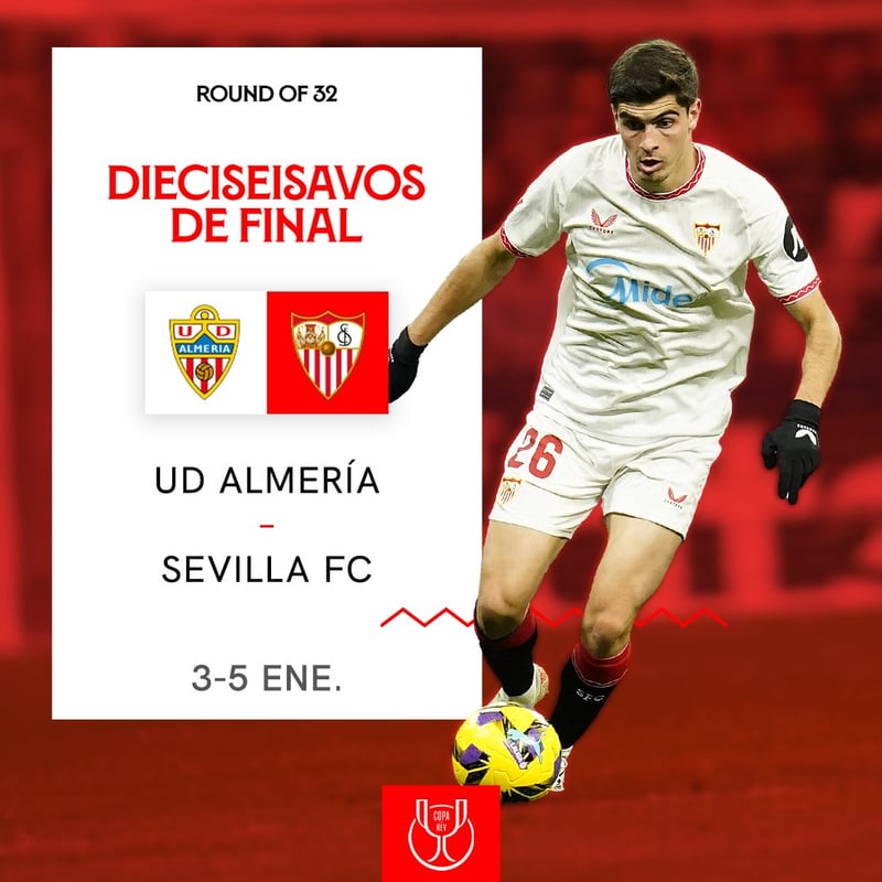 El Sevilla FC despedirá este 2024 con dos citas ligueras ante RC Celta de Vigo y Real Madrid, antes arrancar el año 2025 con una visita a la UD Almería, equipo recién descendido a LaLiga Hypermotion y que, en el sorteo celebrado este lunes en Las Rozas, ha quedado emparejado como rival de los nervionenses en la eliminatoria de los dieciseisavos de final de la Copa del Rey que se disputará entre el 3 y el 5 de enero a partido único en el UDA Stadium. El duelo de rivalidad regional supondrá un 'derbi' particular para los tres ex del Real Betis que tiene el cuadro indálico: los futbolistas Edgar González y Leo Baptistao, además del entrenador, Rubi. No obstante, si para alguien será especial este duelo ése es Alejandro Pozo, un canterano sevillista que se enfrentará al club de sus amores, donde muchos le señalaron en su día como sucesor de Jesús Navas. Precisamente, este reencuentro será el Día 1 Después de Navas (el primer partido sin el palaciego).