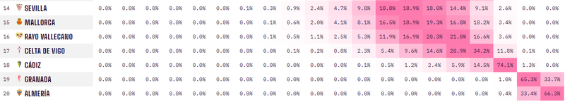 A continuación emergen los dos grandes candidatos a descender a Segunda división que no son otros que RC Celta y Cádiz CF. El superordenador le da al RC Celta un 11'8 por ciento de posibilidades de bajar a Segunda división, mientras que al Cádiz CF le otorga un 74'1 por ciento de opciones de caer a la categoría de plata del fútbol español. La tecnología, finalmente, no da opciones de salvación ni a Granada CF ni a UD Almería, que nunca pasarían, según este método, de la posición 18 de la clasificación de LaLiga.