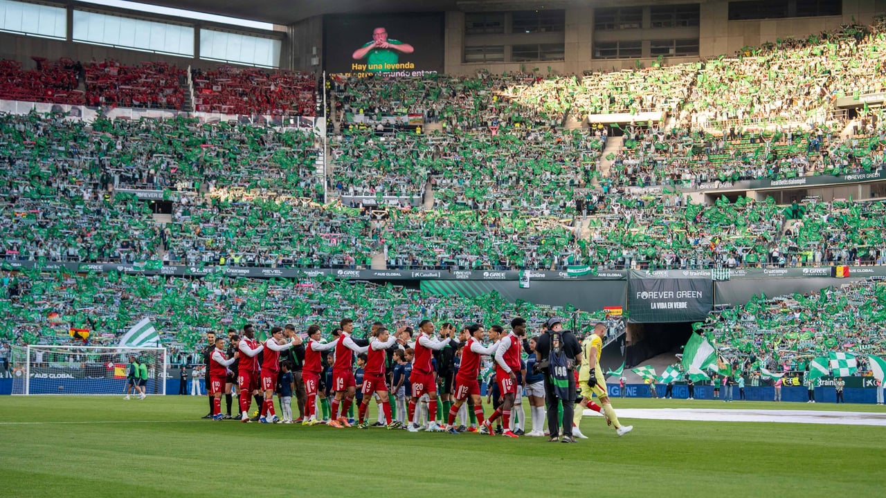 Saludo de blanquirrojos y verdiblancos antes del último derbi liguero.IMAGO