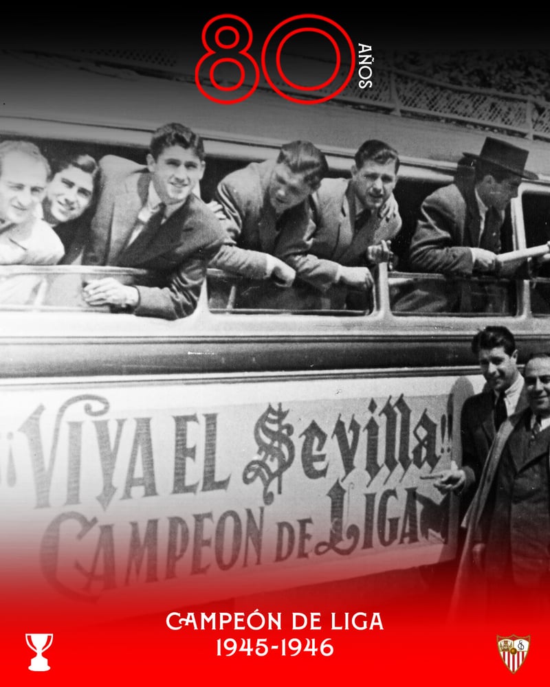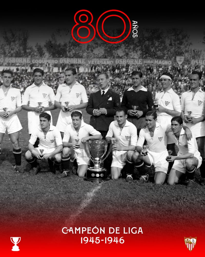 "En este 2026 se cumplen nada menos que 80 años de aquel partido en el Estadio de Las Corts de Barcelona. Separados por un punto de cara a la última jornada, el FC Barcelona recibía a los nervionenses, que aventajaban en un punto a los azulgrana. Esto hacía que, incluso con un empate, los hombres dirigidos por Ramón Encinas pudieran levantar el trofeo. Juan Araujo lo puso todavía más de cara con un tempranero tanto, pero los locales empataron por medio de Bravo a la hora de partido. Iba a tocar sufrir y mucho, pero el Sevilla FC mantuvo el tipo y el marcador ya no se volvió a mover", recuerda el escrito de la entidad nervionense.