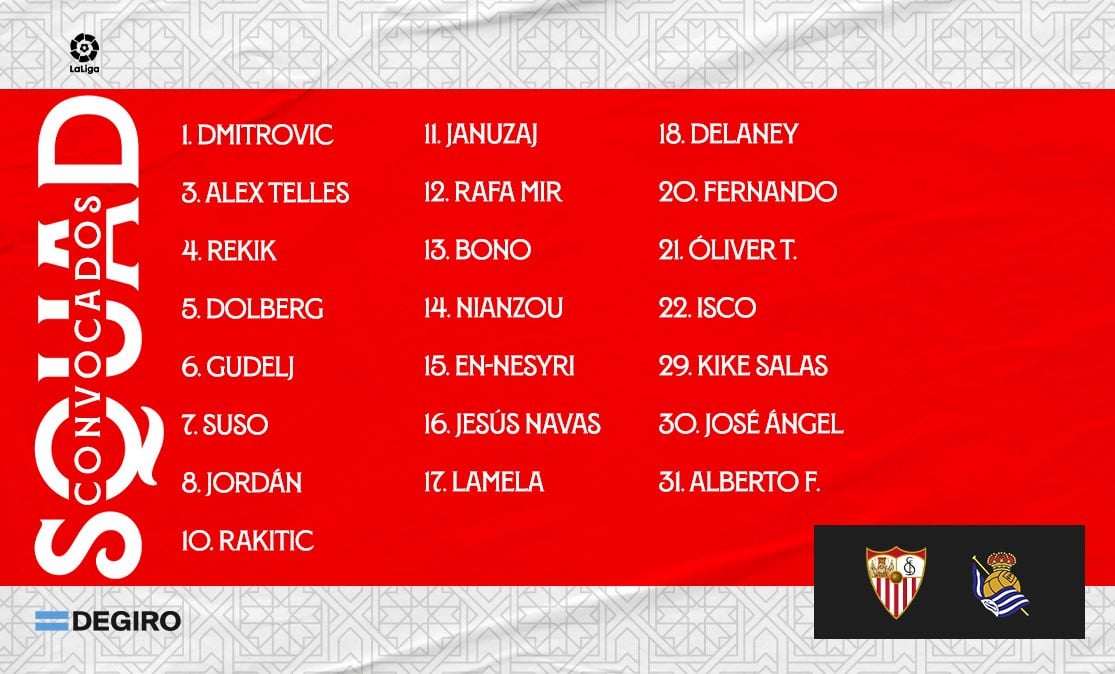 De esta forma, la lista de 22 convocados la conforman: Bono, Dmitrovic, Alberto Flores, Jesús Navas, Alex Telles, Rekik, Nianzou, José Ángel, Kike Salas, Fernando, Gudelj, Delaney, Jordán, Rakitic, Óliver Torres, Suso, Isco, Lamela, Januzaj, Rafa Mir, En-Nesyri y Dolberg.