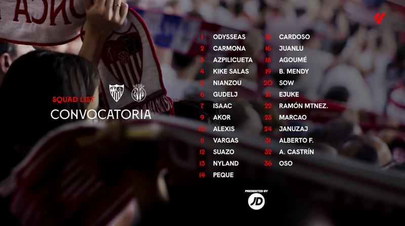 Así las cosas, la lista al completo con los 25 jugadores convocados por Almeyda para el choque liguero entre Sevilla FC y Villarreal CF es la compuesta por los porteros Orjan Nyland, Odysseas Vlachodimos y Alberto Flores; los defensores José Ángel Carmona, Juanlu Sánchez, Marcao Teixeira, Tanguy Nianzou, Kike Salas, Fábio Cardoso, Andrés Castrín, César Azpilicueta, Ramón Martínez, Gabriel Suazo y Joaquín Martínez 'Oso'; los centrocampistas Nemanja Gudelj, Lucien Agoumé, Batista Mendy y Djibril Sow; y los atacantes Adnan Januzaj, Chidera Ejuke, Rubén Vargas, Gerard Fernández 'Peque', Alexis Sánchez, Isaac Romero y Akor Adams.