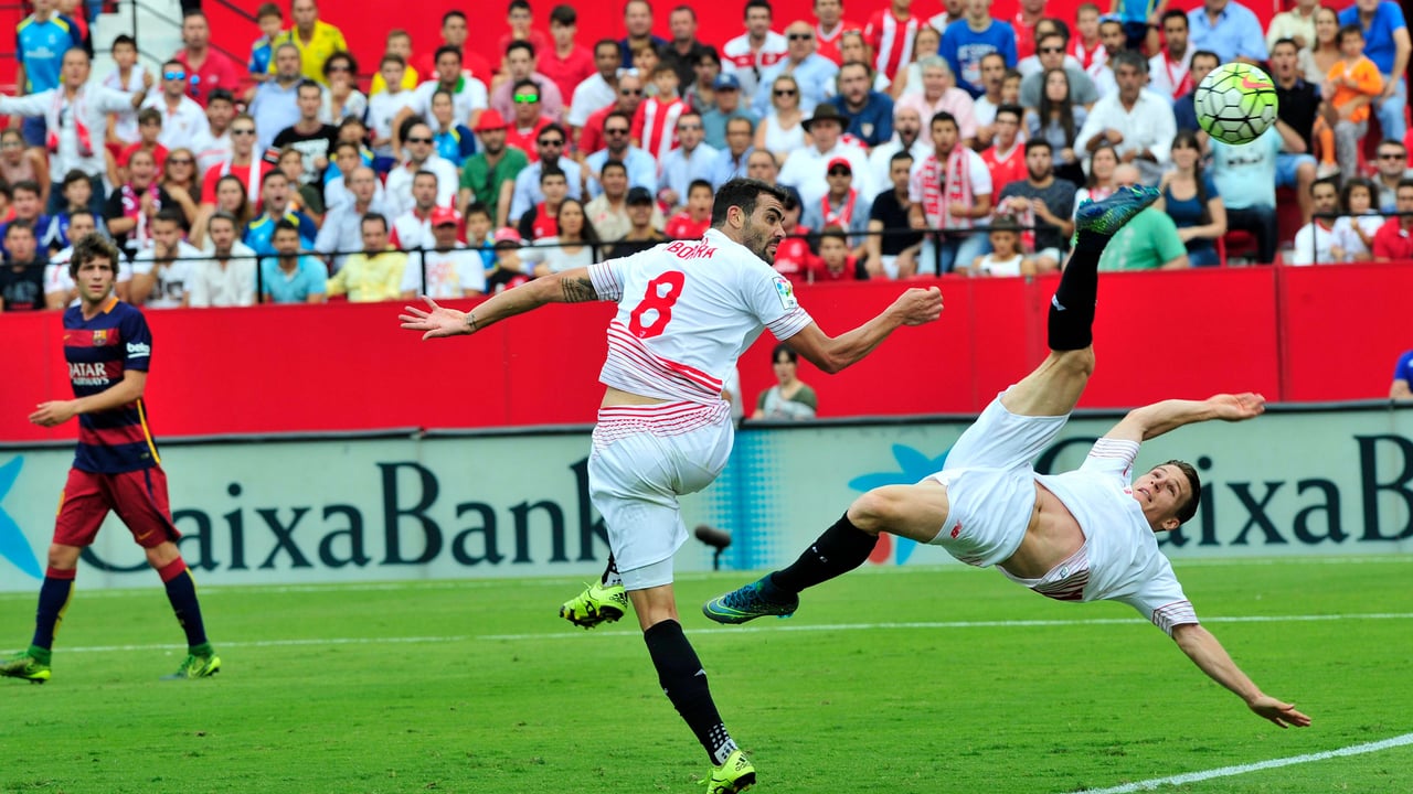 Sergi Roberto, espectador de lujo de la chilena fallida de Kévin Gameiro y el cabezazo a la red de Vicente Iborra a pase un Michael Krohn-Dehli que había marcado ese 3 de octubre de 2015 el 1-0 ante el Barça en Nervión.CORDON PRESS