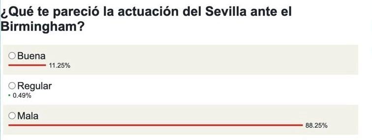 La afición del Sevilla, muy decepcionada con la actuación del equipo en el primer choque de pretemporada ante el Birmingham, según la encuesta Helvetia de Estadio Deportivo