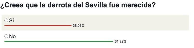 En ESTADIO, hemos querido preguntar a la afición del Sevilla por el partido de su equipo y el merecimiento de la derrota cosechada en el Reale Arena. La respuesta del sevillismo ha sido clara e inclinada a culpar a otros motivos ajenos al rendimiento deportivo. El 61,92% de los votos cree que el resultado final no fue merecido por el equipo de Almeyda, mientras que el 38,08% restante sí creen que la derrota fuera totalmente merecida para el Sevilla. Ya sea por la actuación arbitral o por pensar que la Real Sociedad no hizo merecimientos para llevarse los tres puntos, la mayor parte de la afición del Sevilla creen que la derrota fue inmerecida.