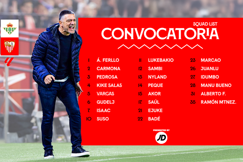 Así las cosas, la lista al completo con los 22 futbolistas convocados por García Pimienta para El Gran Derbi correspondiente a la jornada 29 de LaLiga EA Sports está compuesta por los porteros Álvaro Ferllo, Orjan Nyland y Alberto Flores; los defensores José Ángel Carmona, Loïc Badé, Nemanja Gudelj, Kike Salas, Marcao Teixeira, Ramón Martínez y Adrià Pedrosa; los centrocampistas Sambi Lokonga, Saúl Ñíguez, Juanlu Sánchez y Manu Bueno; los atacantes Suso Fernández, Peque Fernández, Dodi Lukébakio, Chidera Ejuke, Stanis Idumbo Muzambo, Rubén Vargas; y los delanteros Akor Adams e Isaac Romero.