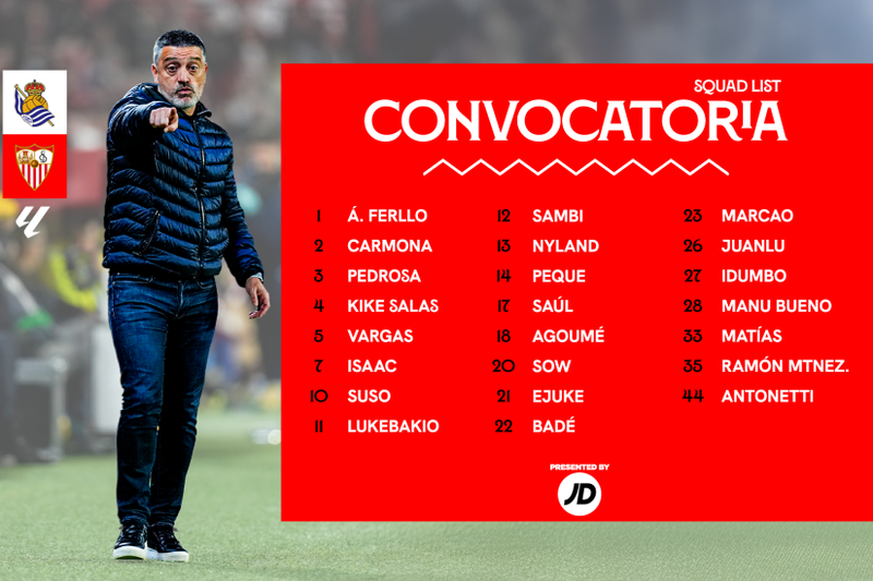 La lista definitiva de 23 jugadores del Sevilla FC para viajar a San Sebastián está compuesta por: los porteros Álvaro Fernández, Örjan Nyland y Matías Árbol; los defensas José Ángel Carmona, Adrià Pedrosa, Kike Salas, Loïc Badé, Marcao Teixeira y Ramón Martínez; los centrocampistas Albert Sambi Lokonga, Saúl Ñíguez, Lucien Agoumé, Djibril Sow, Juanlu Sánchez, Manu Bueno, Rubén Vargas, Suso Fernández, Dodi Lukébakio, 'Peque' Fernández, Chidera Ejuke y Stanis Idumbo; y los delanteros Isaac Romero y Leandro Antonetti.