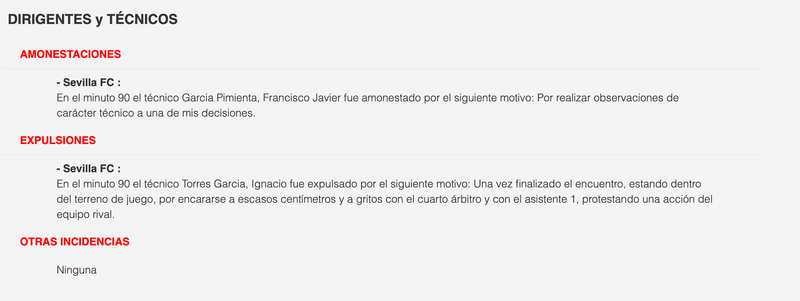 Revisada el acta, sí hubo alguna sorpresa más. Se registró en el terreno de juego una amonestación al míster sevillista, García Pimienta, "por realizar observaciones de carácter técnico" a una de sus decisiones, en concreto señalar falta (clarísima) de Saúl Ñíguez sobre el medio rosarino del Real Betis. Pero, tras el pitido final, hubo más piques entre ambos bandos, algún empujón y varios insultos. Incluso, se vio volar una tarjeta roja, aclarando el documento oficial su destinatario. Se trata de Nacho Torres, preparador de porteros visitante, que ya había protagonizado un incidente en los prolegómenos al zarandear a un recogepelotas, lo que le valió que jugadores como Aitor Ruibal y el 'Chimy' Ávila se lo echaran en casa. No podrá sentarse en su lugar ante el Atlético de Madrid, pues terminaría expulsado "por encararse a escasos centímetros y a gritos con el cuarto árbitro y el asistente número 1" para protestar una jugada.