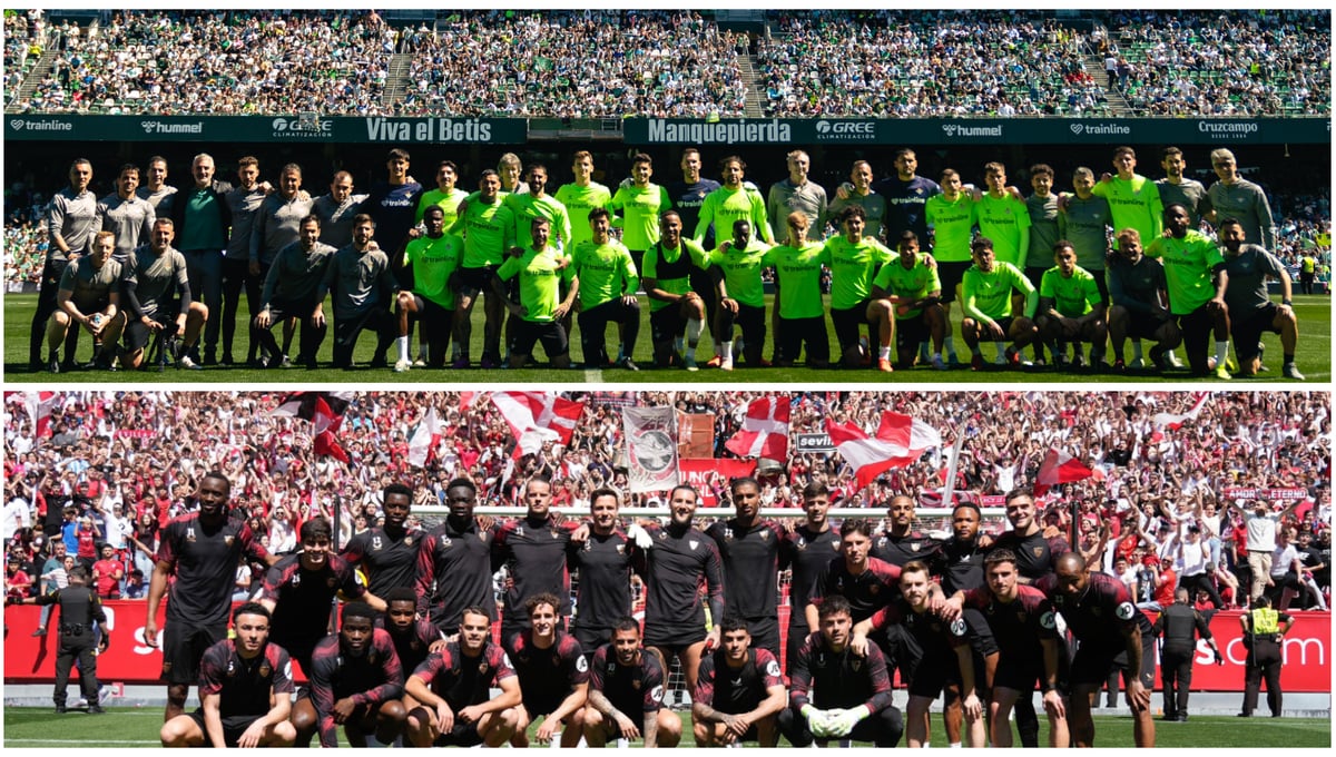 Las plantilla del Betis y el Sevilla posan con sus aficiones tras las sesiones a puerta abierta antes de El Gran Derbi.RBB / SFC