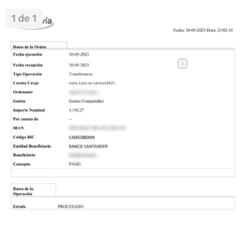 El nuevo calvario de los afectados, que ascendían ya a casi la cuarentena, fue el reintegro de las cantidades que le abonaron. El mismo denunciado aceptó añadir a los 3.735,27 euros de los desplazamientos (con su IVA en una factura que la Policía señala como falsa) el importe de las entradas que, obviamente, estos siete sevillistas no pudieron aprovechar ni recuperar, por lo que les iba a enviar 4.140,27, pero tampoco cumplió en ese aspecto: "Nos envió capturas de supuestas transferencias, con los datos bancarios falsificados. Las autoridades nos dicen que el comprobante está hecho con Word. El código BIC ni siquiera corresponde a la Caja Rural, desde donde en teoría nos mandaba el dinero". Lo curioso es que el tipo, que podría haber cometido fechorías similares con el concierto de Antonio Orozco y los padres de alumnos de un conocido colegio privado de Sevilla, no les ha bloqueado ni se ha dado a la fuga.