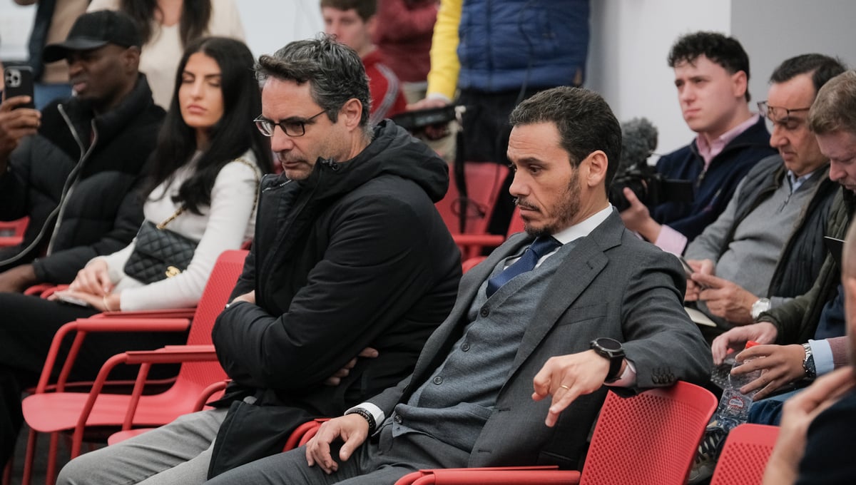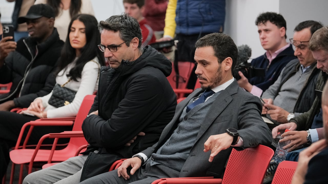 El presidente blanquirrojo, cabizbajo junto a la mano derecha de Orta, Gaby Ruiz, durante la presentación de Akor Adams.Lince
