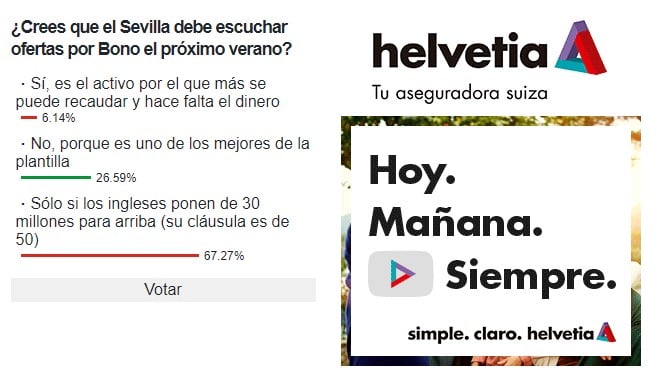 Así, hemos querido pulsar la opinión de la afición ante esta posibilidad de una hipotética venta el próximo verano. ¿Crees que el Sevilla debe escuchar ofertas por Bono el próximo verano?, ha sido la pregunta lanzada en nuestra #EncuestaHelvetiaED, y la respuesta ha sido variada. Pero en lo que coinciden casi el 70% de los votantes (un 67,27% exactamente), es que solo se plantearían la venta de Bono siempre y cuando el club interesado ponga un mínimo de 30 millones de euros, por menos, no lo venderían.