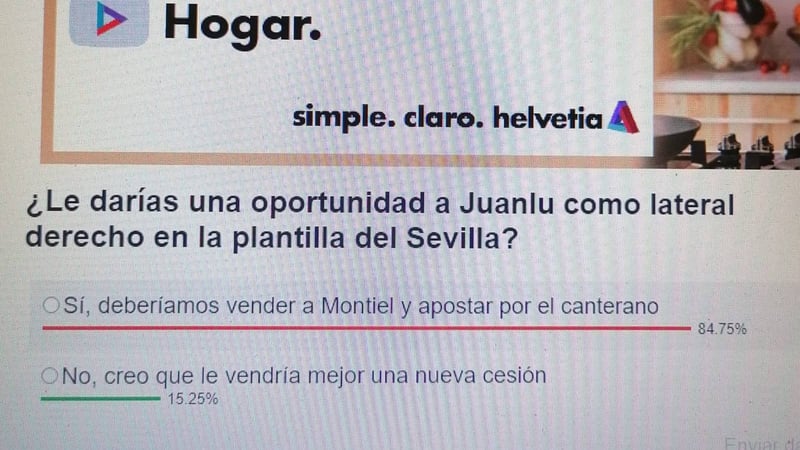 Pues bien, ESTADIO Deportivo ha querido saber lo que harían nuestros lectores en el caso de que fuesen miembros de la secretaría técnica del club nervionense. Y con un aplastante 84,75% de los votos han opinado que lo mejor que podría hacer Víctor Orta es buscarle salida al jugador argentino Gonzalo Montiel y darle una oportunidad al canterano Juanlu Sánchez.