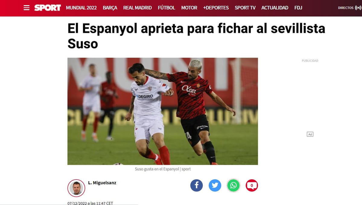 Eso es lo que adelanta hoy el diario Sport, en una información que "está bien tirada", según fuentes consultadas por ESTADIO Deportivo. La noticia en cuestión está firmada por Lluís Miguelsanz, subdirector del periódico deportivo barcelonés y asegura que "el Espanyol aprieta para fichar a Suso". En la línea de lo expuesto anteriormente, asegura que el club perico ha solicitado una cesión que el Sevilla FC ve con muy buenos ojos, pero aún no hay acuerdo económico.