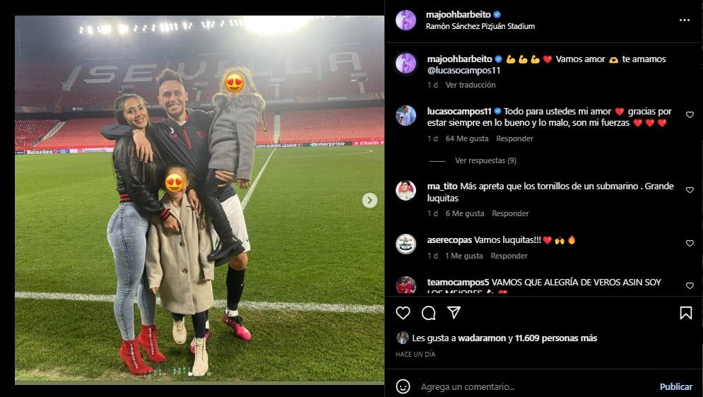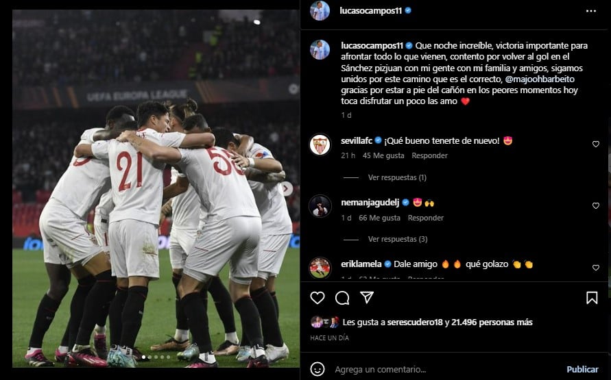Pero no contento con ello, el argentino se vistió de asistente en el tercer gol sevillista, con un buen desmarque y una mejor asistencia, de tacón, para que Gudelj fusilara a Benítez. Tras el choque, el extremo no podía esconder su alegría por el partido realizado como tampoco pudo reprimirse su esposa, Majo Barbeito, quien sabe muy de primera mano todo lo que ha sufrido Lucas Ocampos estos meses atrás en la capital neerlandesa.
