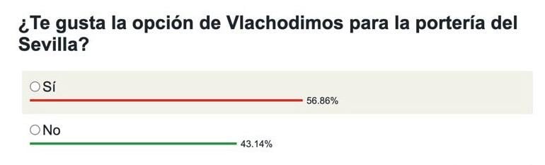 En Estadio Deportivo hemos querido preguntar a la afición sevillista por su parecer con el fichaje del cancerbero con nuestra encuesta Helvetia. En la misma, el sevillismo se ha mostrado muy dividido en cuanto a su incorporación a las filas de Almeyda. El 56,86% de los votos ha apoyado el fichaje del guardameta griego por el conjunto hispalense. Por otro lado, al 43,14% no le gusta la opción del portero para defender la portería nervionense. Por lo que, a pesar de estar muy apretado, a la mayoría de la hinchada sevillista le gustaría ver a Vlachodimos como portero del Sevilla la próxima temporada.