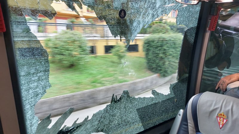 El autobús del Sporting de Gijón fue atacado por ultras del Real Oviedo a su llegada al Estadio Carlos Tartiere. No hubo que lamentar daños personales entre la expedición