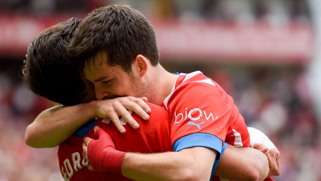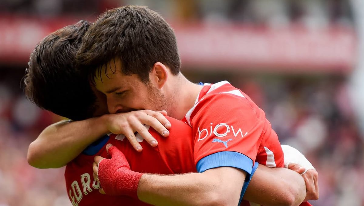 Abrazo entre dos jugadores del Sporting tras marcar gol@RealSporting