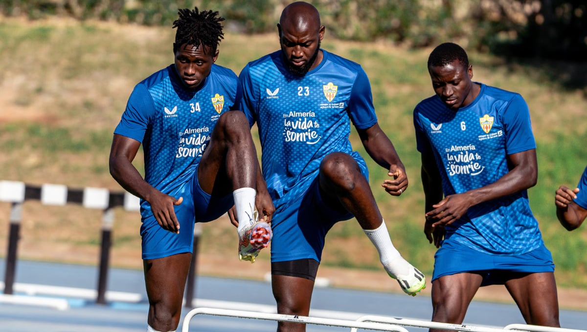 Ibrahima Koné junto a Marciano y Lopy durante un entrenamiento de la UD AlmeríaUDA