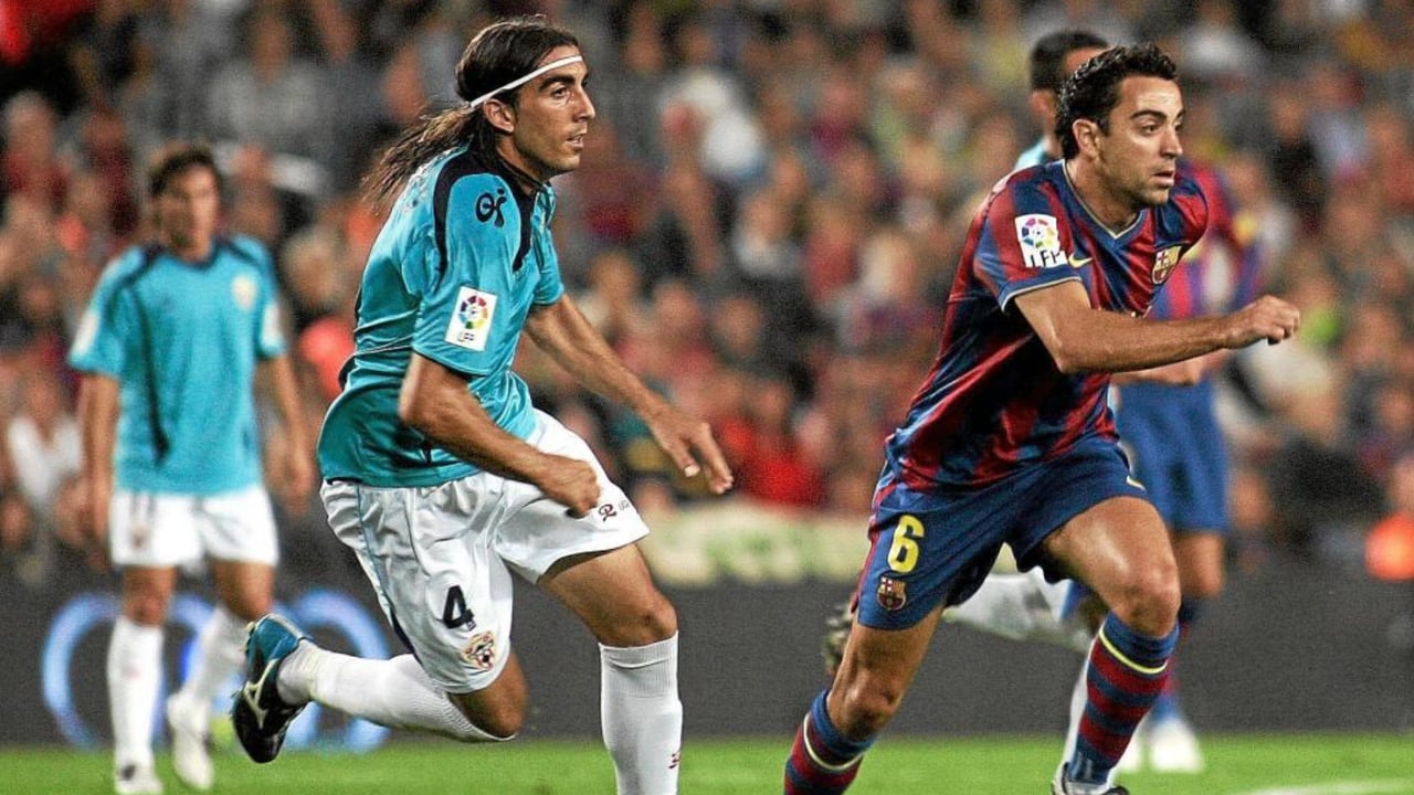 Chico Flores marcando a Xavi Hernández con la camiseta del AlmeríaUES