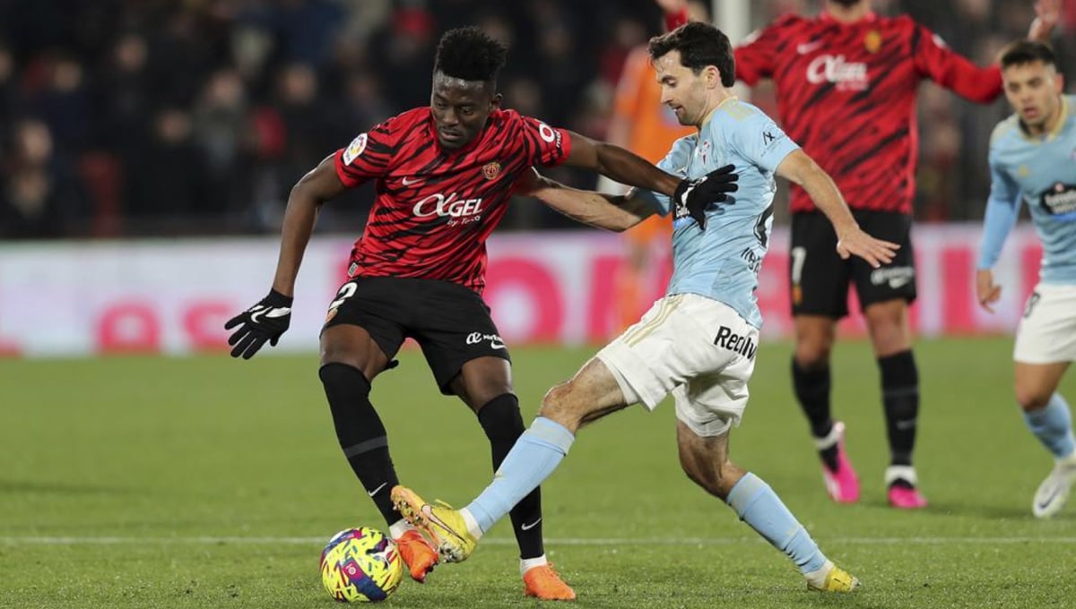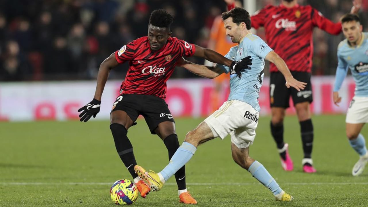 Iddrisu Baba disputando un partido de LaLiga con el RCD MallorcaUES