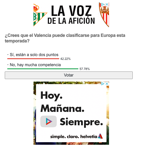 De hecho, entrar en Europa parece más que complicado. Así lo demuestran los resultados de la Encuesta Helvetia de hoy en ESTADIO Deportivo. Lo cierto es que no ha habido mucha diferencia entre las dos opciones. Aun así, casi el 58% de los votos recogidos a través de nuestra web creen que el Valencia CF no podrá clasificarse para los puestos europeos debido a la gran competencia que hay actualmente.