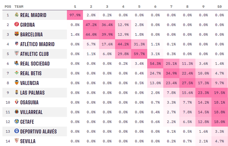 Real Betis y Valencia CF son los grandes favoritos para quedar en la séptima y la octava posición respectivamente ya que el superordenador le da los siguientes porcentajes a los dos equipos. Al Betis le da un 34'9 por ciento de posibilidades de quedar en séptima posición, mientras que al Valencia CF, la plaza más probable que el otorga este sistema es que quedará en la octava con un 27'5 por ciento de opciones. recordemos que si el Athletic Club gana la Copa del Rey, la séptima plaza da clasificación para participar en la próxima edición de la UEFA Conference League.