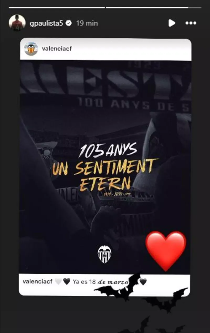 El brasileño ha compartido en sus redes la publicación del Valencia, añadiendo murciélagos y un corazón. De este modo, viene a demostrar el amor que siente por una camiseta que ha defendido durante siete temporadas, llegando a disputar 220 partidos oficiales, en los que firmó además ocho goles, portando también el brazalete de capitán.