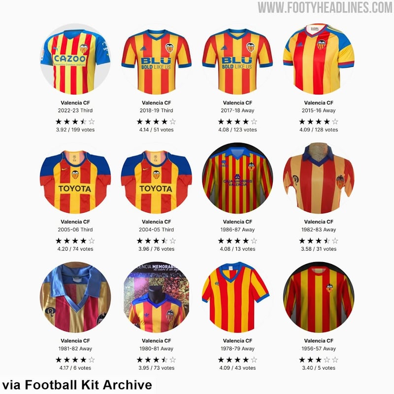 Ya se conocen los tres diseños para las equipaciones del Valencia de la próxima temporada, que recupera la 'Senyera' para la tercera vestimenta y un color de los 90 para la de visitante