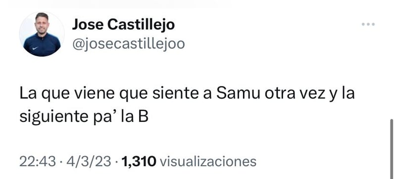 Las redes sociales son un arma de doble filo. De gran ayuda y soporte en algún momento y muy traicioneras en otro. Es lo que le ha sucedido ahora al hermano del jugador del Valencia CF Samu Castillejo, José. A través de su cuenta de Twitter criticó en más de una ocasión a Rubén Baraja. Unas manifestaciones por escrito que ahora salen a la luz rescatadas por los aficionados 'taronjas'. La primera crítica que encontramos en su perfil data del 3 de abril, fecha en la que se disputó un Rayo-Valencia que finalizó en empate a uno. Su hermano fue suplente, saliendo a jugar en la segunda parte mejorando las prestaciones del equipo. José Castillejo dijo: "La que viene que siente a Samu otra vez y la siguiente, pa' la B".