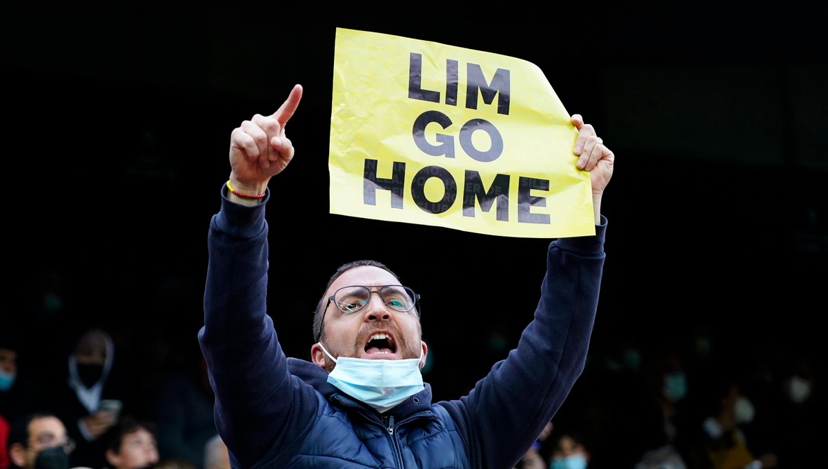 Aficionado del Valencia portando una pancarta pidiendo la salida de Peter LimCordon Press