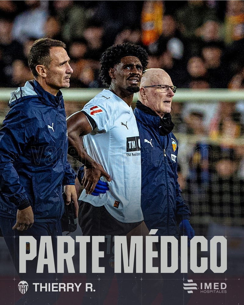"Tras las pruebas realizadas, el jugador del Valencia CF, Thierry Rendall, padece una lesión de la musculatura isquiotibial de su pierna izquierda, sufrida durante el partido de este sábado frente al Elche CF. El lateral valencianista seguirá un plan terapéutico médico, fisioterápico y de readaptación en la Ciudad Deportiva hasta mejoría clínica", ha detallado el parte médico.
