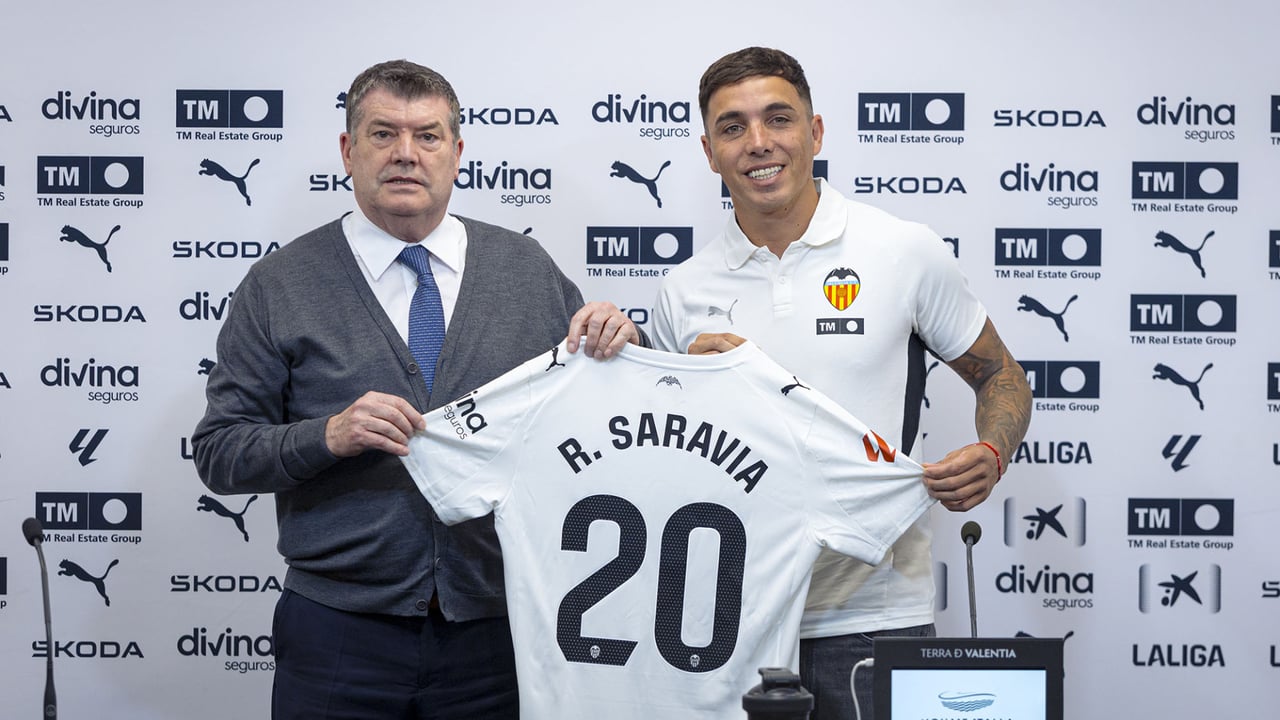 Renzo Saravia ha sido presentado este mediodía como nuevo jugador del Valencia. El lateral argentino, que llega a Mestalla solamente hasta final de temporada por la lesión de Foulquier, se ha mostrado entusiasmado con la oportunidad que le llega de jugar en LaLiga y espera aprovecharla para ganarse la continuidad. "Estoy muy feliz por esta oportunidad que tengo en mi carrera, agradecido a todos ustedes también por confiar en mí en este momento, vengo muy motivado, con muchas ganas y a no ser la excepción como todos los cordobeses que han venido aquí, los argentinos que han representado esta institución muy grande. Muy motivado y muy feliz de estar aquí", ha dicho en primera instancia para luego responder a las preguntas de los medios.
