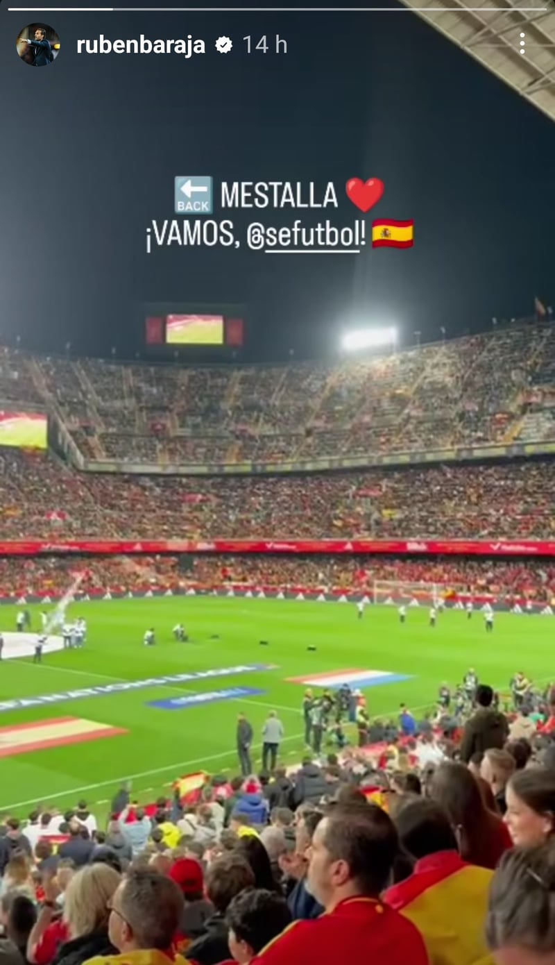 Rubén Baraja acaparó las miradas de los aficionados en Mestalla en el duelo entre España y Países Bajos. Desde su destitución, el técnico vallisoletano no había aparecido por el estadio che que ya por últimas clamaba la marcha de la leyenda valencianista. El ex entrenador del Valencia no ha soltado jamás una mala palabra del club y no se ha pronunciado acerca de su destitución, manteniendo la compostura ante la desagradable situación que le tocó vivir y alejado del foco mediático. Pues, en el duelo de la Nations League, Rubén Baraja rompió su silencio y volvió a Mestalla. El vallisoletano lo hizo saber a través de Instagram dónde publicó un vídeo dentro de Mestalla acompañado por unas breves palabras de apoyo a la Selección española y unos emoticonos que reflejaban su regreso al estadio dónde ha vivido tantas noches mágicas. Un emoticono de "volver", la palabra Mestalla en mayúscula y un corazón rojo completaban el "Vamos España" de Rubén Baraja en su cuenta personal de Instagram.