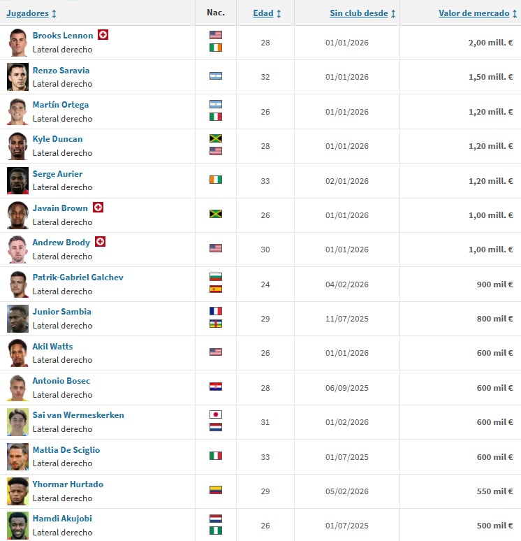 Echando un vistazo a lo que ofrece el mercado de futbolistas libres, no hay grandes nombres a la vista. El más valorado según Transfermarkt (2 millones de euros) es el estadounidense Brooks Lennon, de 28 años y sin experiencia en Europa, donde pasó por la cantera del Liverpool, ahora en paro tras acabar contrato con el Atlanta United de la MLS. Sí conoce LaLiga el veterano Serge Aurier, de 33 años, que militó en el Villarreal en la 21/22 y ha tenido una última aventura en el Persepolis de Irán tras pasarse la campaña pasada en blanco.