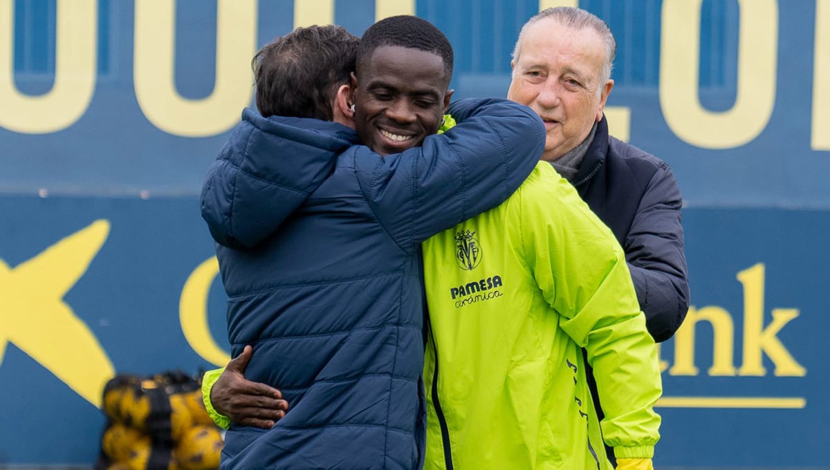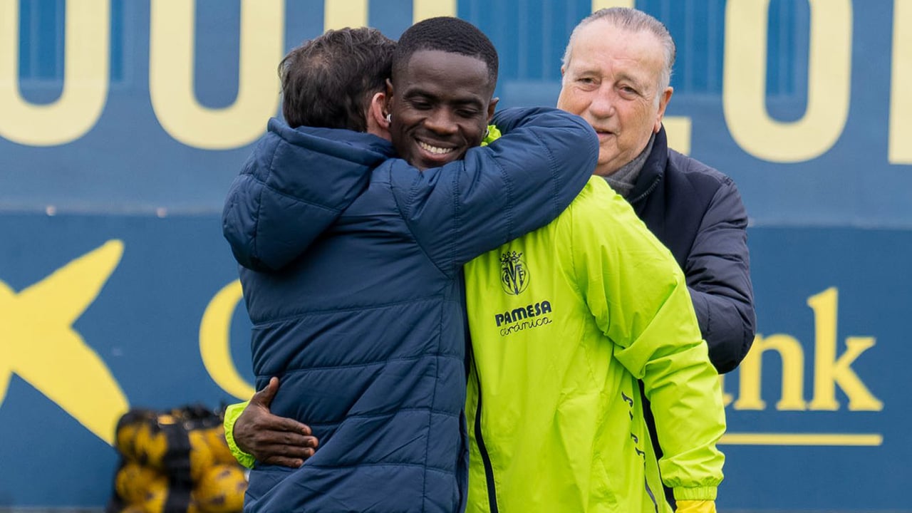 Marcelino abraza a Eric Bailly bajo la atenta mirada del presidente, Fernando Roig.X: @VillarrealCF